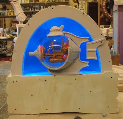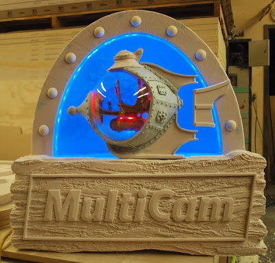 The sub’s sign has been laminated up from many layers of one inch Precision Board HDU. Dad had used up all the scraps he had saved for this purpose. The next step is to bring the wood grain texture around the edges.