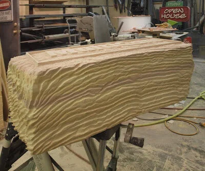 To bring the texture around, dad used an air powered die grinder. It eats through 30 lbs. Precision Board HDU in a hurry. He used a tapered bit with a round end so he could mimic the woodgrain on the front. He did the top first, keeping it relatively flat. (The sub will sit there.) Then he started bringing the grain over the end and around to the front. Diagonally grain works well and adds interest.