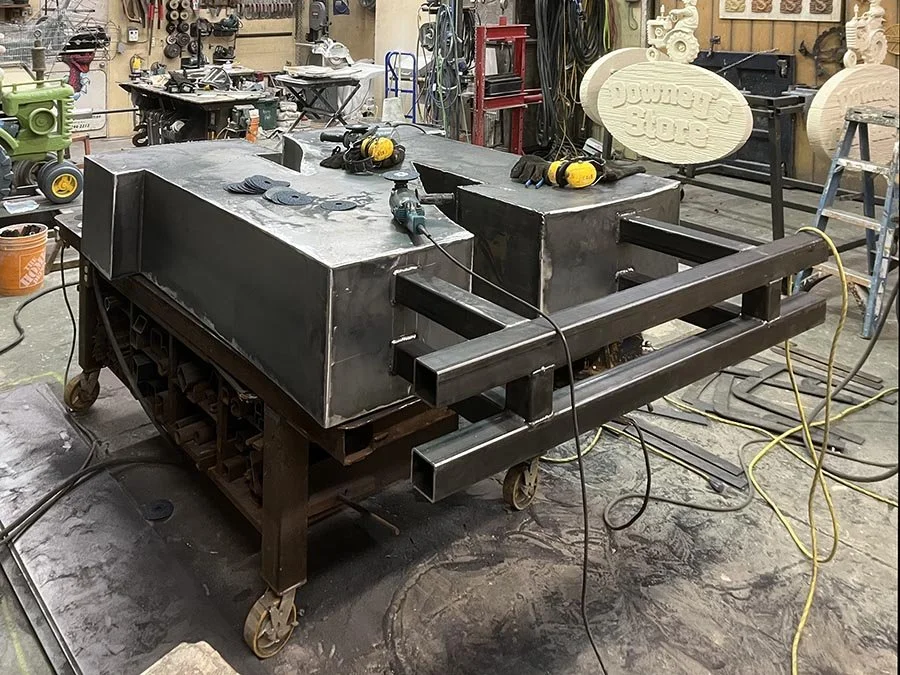 Today, we kept busy in the shop, welding the front and back of the giant ‘N’ for DOWNEYS. The welding on the letter is now complete, with just a little grinding left to finish that part of this project. By first coffee time tomorrow, this letter should be on its wheels and ready to roll out of the shop. Then we can begin the fabrication of the final ‘D’ and the ‘E’. Stay tuned…