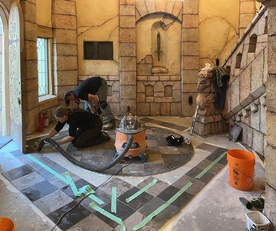 We never seem to do things the easy way. Matt has been busy in the Copper Crown in the Hazelnut Inn, laying tiles on the lower floor. He started with the center tiles of a seven-foot diameter circle in the sitting room. These were laid square to the room. Then came an outline of cut border tile. Now Matt is beginning to lay the balance of the tile in the room on the diagonal, with a row of cut border tiles around the perimeter. This kind of complex tile pattern means tons of cutting and fitting, but it will look fabulous when it is all done! Stay tuned to see it come together…