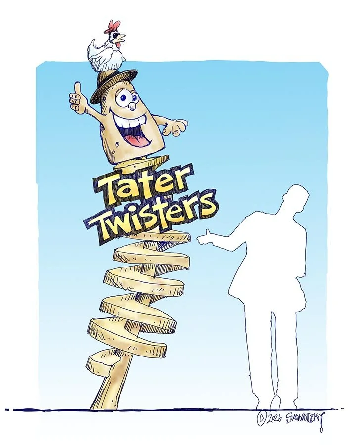 Every time I walk into the shop, I have to laugh, for it always seems to be full of the most fun builds. Currently, there’s a massive skull rock, a fifteen-foot-tall tire horse, three mine cars and tucked in the corner is Henry’s parade float spaceship. The giant DOWNEYS letters are just outside in the parking lot, along with the four other signs bound for Downey’s Farm, to be loaded onto the transport truck this coming Thursday. As good as that list of current projects is, the good news is that we have a bunch of other just as crazy projects in the works. One of those is this Tater Twisters sign for Vala’s Pumpkin Patch in Nebraska. Stay tuned for lots of fun in the next months…