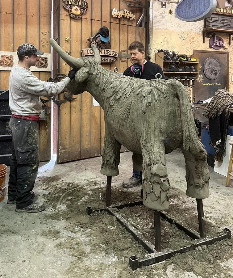 We were confident we could sculpt a nice Highland cow in concrete, but this was a first for us. The key was to get the mud on thick, let it set up perfectly and then sculpt in the hair. Three of us did the sculpting, Matt, Jay and I, as Laura art directed from above while she was applying wire to the upper portion of the giant skull rock base. The cow turned out really nice, and it will be ready for paint next week. Stay tuned…