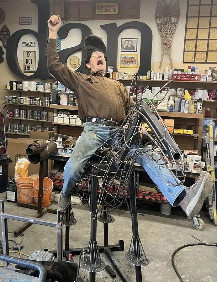 We have designed and begun to fabricate a saddled horse that will be part of a roping experience for kids at Kraay’s Family Farm in Alberta. It will be a partner to the Highland cow we welded previously. As always, it starts with a sturdy welded-steel structure, followed by a hand-formed pencil-rod armature. I completed the horse armature on Friday afternoon and then took a quick test drive to make sure all was well. It passed. :)