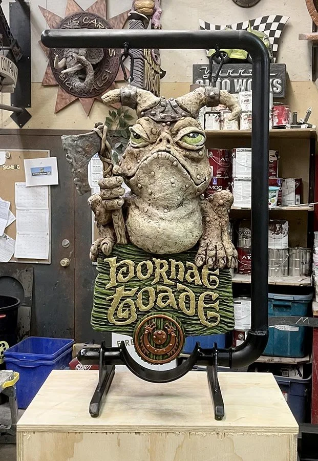 We spent a good part of the late morning cutting plywood and assembling the shipping crates for my Sign Invitational entries. Things went pretty well, but when I set the pieces on top of the crates as they will appear at the ISA show, the Hornae Toade sign looked far too tall. I studied things for a minute and decided I could easily cut the bracket apart and weld a section of large-diameter pipe into the lower pipe to fit around the shield medallion on the bottom of the sign. I could then shorten the vertical frame (and shipping crate) by almost 4”, making the entire display 8” shorter overall and much more pleasing to the eye. We’ll enjoy the signs in the shop until next week, and then I will send them on their way south.