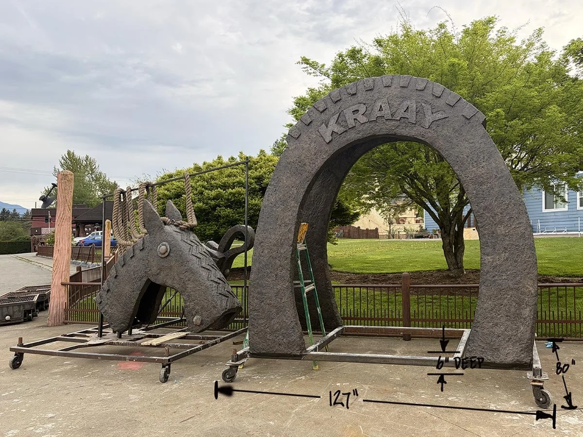 We can finally get a good look at the giant tire horse now that we have pulled it out of the shop. It will soon be bound for Kraays Family Farm in Lacombe, Alberta. To get an idea of the scale of this beast, once the head and tail are mounted on the gigantic tire (on site), it will measure about fourteen and a half feet tall. It will be an awesome spot to grab a selfie!