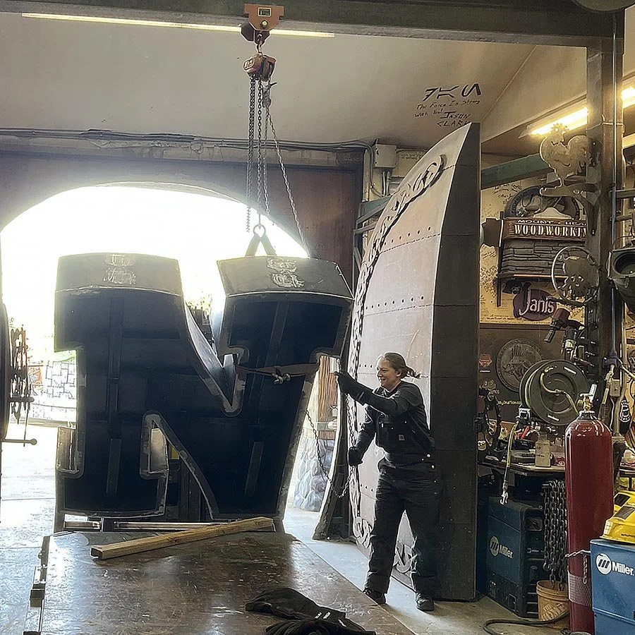 It was with great delight that we hooked the giant letter ‘N’ and lifted it into a vertical position. I then welded on the bottom pockets for the temporary wheels and moved it out into the parking lot to join the ‘W, O and Y’ already there. The next letter in progress is ‘E’. Stay tuned…