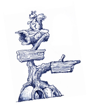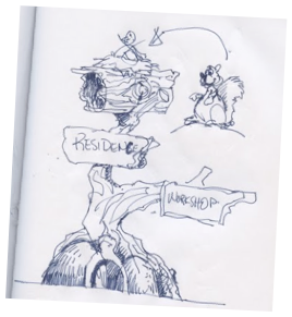 It always starts off with an idea of course. These ideas are generally worked out in my sketchbook in very rough form. the first drawing was done using a rollerball pen (my favorite). I didn’t spend a lot of time on it - five minutes at most. I showed the scribble to Janis for her input and approval - then scanned it into my computer for the next step. Using a digital drawing pad and Adobe PhotoShop I straightened it out, cleaned it up and moved the squirrel to the top instead of the bird. Then in about 15 minutes I reworked the sketch, freehand, using the digital drawing tablet instead of real pen and paper. I then added in color and the sky background. The client wouldn’t normally see the concept art until this stage.