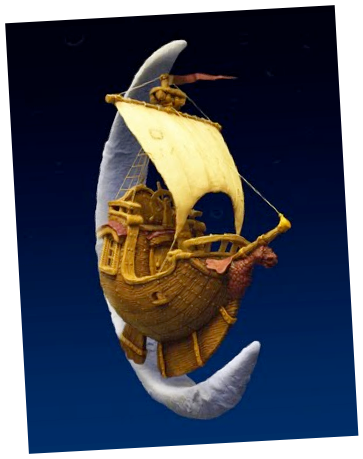 Our business is almost impossible to describe, never mind sum up in one small image. While building a display model of a little ship for my studio I fell in love with the idea of it as the new logo for our company. Spaz the dragon, our long time mascot, became the figurehead on the bowsprit. But the ship needed one more element to add some fantasy... something to symbolize the magic of realizing dreams. The saying ‘once in a blue moon’ proved to be the catalyst for the additional element and the ship looked perfect sailing though the sliver of a new moon on a dark field of stars. From this sculpture our new logo was born.