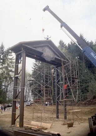 We invented it as we went along for this was our first project of this type and we didn’t know who to ask for advice. We worked incredibly long hours, welding, fabricating. wiring and troweling on the concrete. Then we painted it to look old and weathered. Amazingly we met the impossible deadline, and even had time to mow the freshly planted sod and water the new shrubs before the dignitaries arrived.
