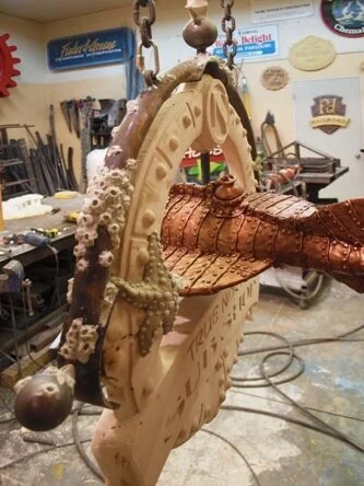 Tomorrow I’ll finish carving the heavier textures into the piece before the thick, creamy primer starts being layered on, adding more subtle textures and surface detail where necessary. Then the real fun starts as the metallic base coats and then layers of subtle color will be painstakingly applied making the aged sign look like its been hanging around the salt water for a long, long time.