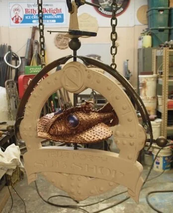 I’m working on a project now in the shop that is just such a challenge. The detailed, dimensional sign involves designing, machining, sculpting, fitting and welding painstaking metal work, lots of detailed painting and even a little 23K gold leaf work before we are done. I finished machining, sculpting and painting the submarine late last week... then over the weekend designed the compass border and carved it from High Density Urethane. Today I bent the heavy steel frame and fabricated the tricky bracket before gluing it all together.