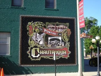 One such meet was held this past June in Pontiac, Illinois. I was asked to jointly design and co-lead the painting of a mural to celebrate the Chautauqua gatherings which were held there around the turn of the century. My co-leaders for the project were David & Susie Butler from Syracuse, Indiana. I’ve known David for many years, having met him and Susie at previous Letterhead meets I had attended, both in Canada and the United States. David looks like a mountain man with his full bushy beard. He and Susie are among the kindest and most generous people I know. David loves and is world renowned for his ability to design in the ornate and flowery styles of yesteryear. Over several weeks we designed the mural which was approved by the folks in Pontiac. Then it was time to paint!