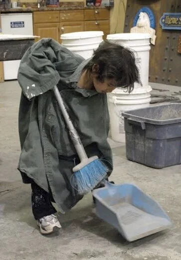 At four and a half years old there aren’t too many jobs in the shop Phoebe can safely do but she sure likes to help! Although my work slows down some, having her around is worth every second. I purposely leave the floor messy when I know she is coming. There is a broom and dustpan with her name on them for the task. If Phoebe is wearing good clothes I know to put a work shirt on her for as we learned from experience that dirt and paint can somehow jump a long ways onto good clothes.