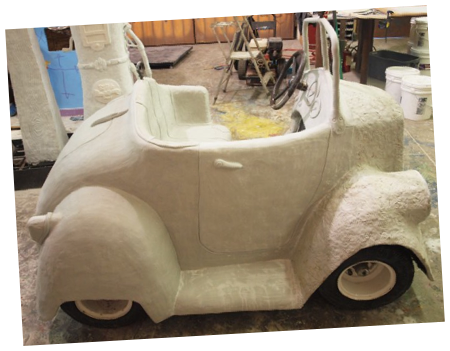 Progress was rapid again today on the little car. Bec did some priming and base coats on the gas pumps while I was busy on the car. The pumps and sign are looking pretty fine. The interior, dashboard, windshield and passenger door were sculpted to completion. This only leaves the front fenders, grill and hood to go... and we should be able to accomplish those tomorrow without too much trouble, hopefully.