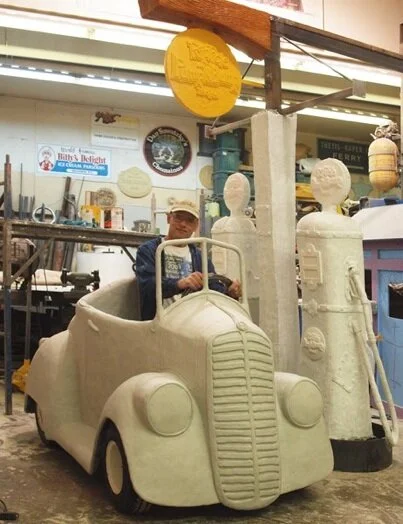 The truth is the paint process will take another week or so but today I finished the sculpting of the little car. The pumps behind the car are primed and the beam and sign above have the base coats of paint completed. It took a little better than 400 pounds of epoxy to complete the project - all mixed and applied by hand. While I enjoyed the process immensely I am also more than happy to go on to the next stage. I know my hands will appreciate the change of pace.