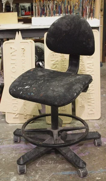 Tools are called by different names. If I ask for a carving tool and I’m working with sculpting epoxy my helper will go to the tool chest and bring back an ordinary sharpened stick. If I’m sculpting concrete they will bring me a steel brick mason’s pointing tool. A carving brush is an old paint brush now used to smooth carved concrete. If I ask for Blackie they will bring my old office chair - now used in the shop. It was named by Phoebe who often plays in our shop while I work. She likes to drag it around with a leash... her pet chair. If I ask my helper to grab me a ‘step’ they know I need a short ladder. Our ‘baker’ is a low scaffold. Many of our tools are defined by how there’re used or by an event which earned the tool a nickname.
