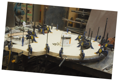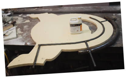 The first two of six layers of High Density Urethane were hollowed out for the structural steel then glued together and clamped tight. Next up we’ll weld the assembly to the sturdy post before we add the last four layers. The sign is coming together fast and looking pretty good!