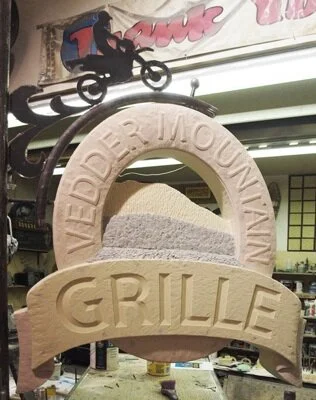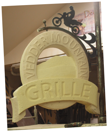 Towards the end of last week we were busy preparing for a trade show display we were to do over the weekend. As always, that’s when things get busy. It is simply the law - even at our place. I did manage to sneak in a little progress on the Vedder Mountain Grille sign however. I had to do the work between other projects - a little at a time. First I worked on the edges of the sign, evening things out and then adding a subtle texture. The scroll got a little detail on the edges and the mountain shape and texture were worked in.