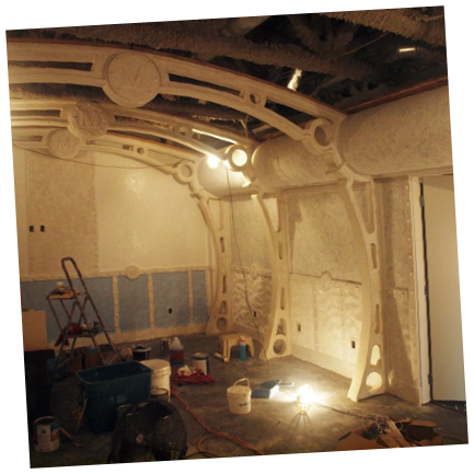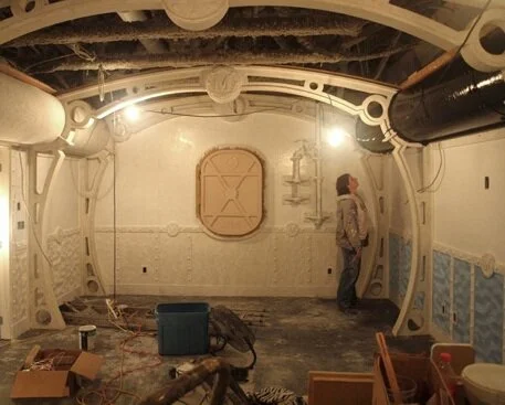 We’ve put the most hours into the submarine room as the flooring is only a week away now. We were held up by work being done overhead by other contractors, but that is all done now. I finished the woodwork and glued on the last of the rivets yesterday. Today we finished the priming and texturing and started in on the base colors at long last. Over the next days it will come together in a big way I’m sure.