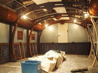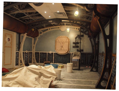 It has been years since I have done T-bar and things have changed considerably since. My memory had conveniently blanked out the time it took to accomplish the last time. The biggest challenge (besides the curve of the beams) was to satisfy the current building code as it now all has to be anchored seismically as do all the lights and other hardware up there. Working overhead has never been my favorite task... and it has now been five days of overhead effort... with almost two more days to go. While I was at it I decided to paint the ceiling the same pearl blue as the walls. Rivets were also glued to each corner of every tile to add a little detail. I used a total of 442 rivets on the ceiling. In hindsight the ceiling detail was a whole LOT more work than I imagined, but it also transformed the ceiling into something that belongs in the room. It was well worth the effort.