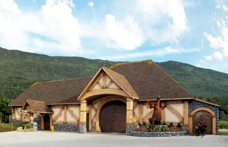While we could have built an inexpensive, utilitarian steel building, we instead decided to build something much more imaginative. We would be looking at this building for many years to come. It has to give our customers a clear idea of what we did inside as well. The construction is of concrete filled styrofoam blocks, which provide awesome sound and heat insulation. The exterior is of sculpted concrete, allowing us to give it a fairytale look with oversize timbers and colorful stonework. A giant 12’ dragon flies over the planter out front. Massive, riveted, magic doors dominate the center of the building. This is no ordinary place.