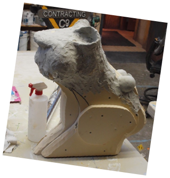 I couldn’t resist putting the sign into production right away for this one was going to be especially fun. I cut out the pieces to make an armature for the two bull’s heads and Sarah got to mixing the sculpting epoxy we would need. We got a good start and it was getting a little bit of bull shape by the time it got to be quitting time.