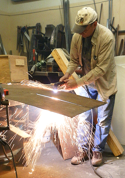 As I thought about the current problem, I remembered that rusty steel out back. I went outside to my bone yard... and there it was! The surface was pitted badly. It was a little bent from the forklift use. But it was plenty big and perfect for this task. I used my grinder to whip off a surface layer of loose scale, then fired up my plasma cutter - hand held of course, for a straight line was the last thing we needed here.