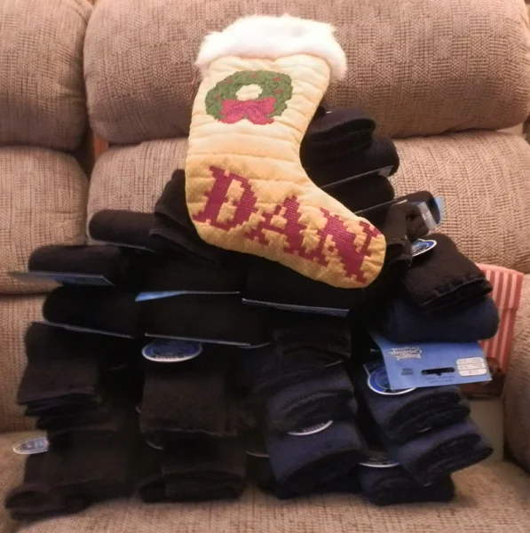 Each year we make a wish list for the family gift exchange. I ALWAYS put socks on my list, but Janis ALWAYS sneaks back after I'm done to cross them off the list for she has a secret stash of my favorite brand of socks for when I need new ones - doled out one pair at a time, at her discretion of course. Each time I make a huge case about how a fabulous day always starts with some comfy NEW socks.
