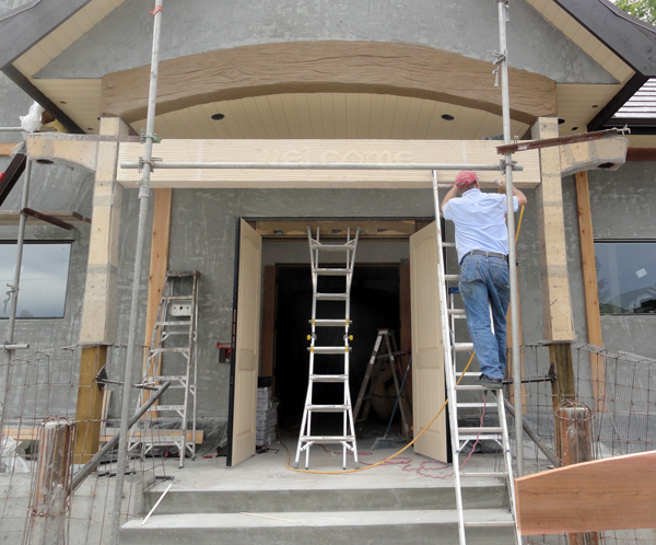 Once I arrived onsite after a little time in my office I climbed up the ladder to finish off the beam over the entry. Next will come the rest of the concrete sculpting to create the posts, and fun brickwork. It is going to look pretty cool! It is now time to design up the sign that will hang front and center.