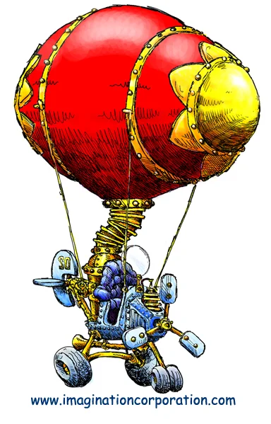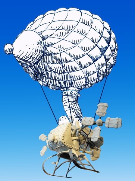 Then I did a composite photo/drawing with to imagine how it would look hanging in my studio when it was done. Next week the new fourth axis CNC router will help me put form to this very old vision at long last. This drawing helped me determine the scale and final design of the balloon.