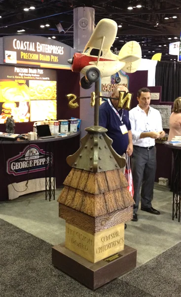 Below is the plane/weathervane we built a few of years ago for Coastal Enterprises who make the Precision Board, glues and primers we use. Our job on this piece was to use the High Density Urethane to create as many faux surfaces and finishes as we could muster in one piece. The toughest challenge of this project is the small space we could use measuring only two feet by two feet! The deadline was tight and it went from a quick sketch to finished piece in only four days. It was fun and still holds up well after all this time. Thanks to my good friend Mark from Hawaii for sending me this great picture of the display.