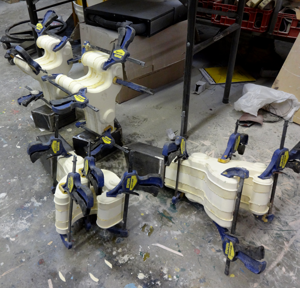 We first welded up some sturdy steel tubing to laminate the cut HDU pieces over. This heavy framework will be welded to the train engine and log car frames to hold the hitches in place. Late this afternoon I glued and clamped the many pieces together.