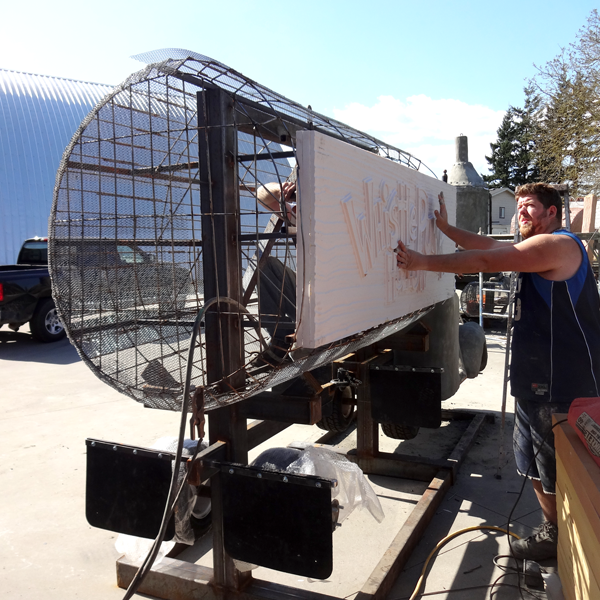 By the end of the day the face of the log on the truck was routed and laminated to it's frame. Little Matt climbed into the log one last time to weld the sign structure into the log frame.