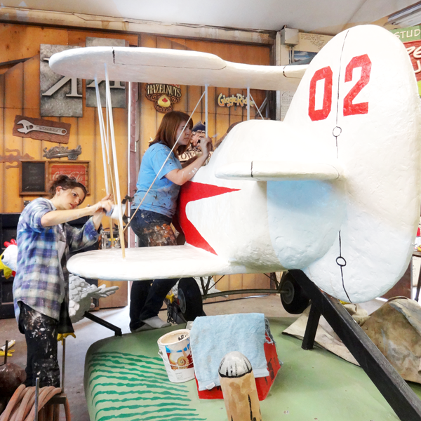 With Whistle Punk Hollow Adventure Golf due to open in a few days and the Parade float due a few days after that we are going full blast in our shop. Sarah and Hailey are busy putting a fresh coat of paint on the float.