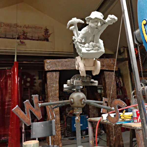 The water tower we installed last week still needed a weather vane. I've been thinking about what I would fashion until I spied the miner sitting in the corner. It was perfect. I bent up some steel, cut a bunch more and then welded up all the pieces. Another bit of time was spent grinding things nice and smooth. Then it was time for a little sculpting. It didn't take long to add the detail to the car and then sculpt the miner, who rides in the car with a giant gold nugget clenched in his fist.
