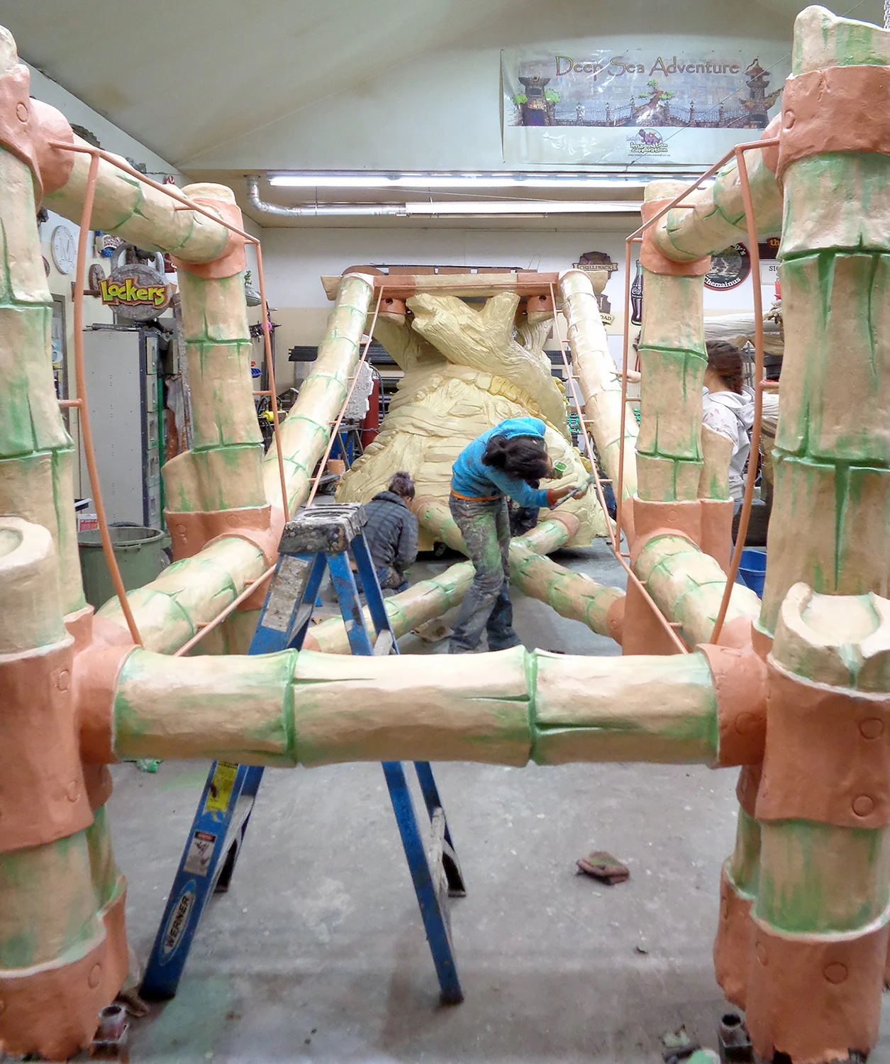 Every time there is an oversize feature in the shop as many people as possible put in every available hour getting it finished and out the door. The reality is that little else can fit in the shop until we are done. These days that means everyone is busy on the treehouse. The base coats are now behind us and the first glazes are well under way. The tree and bamboo poles are looking pretty spiffy.