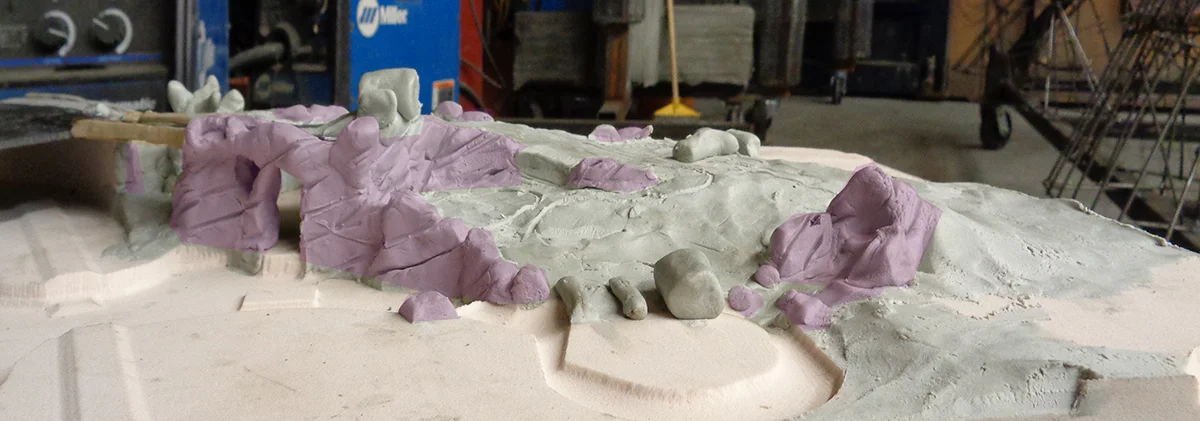 To create the model I used the scale plans to generate a routing file. Our MultiCam CNC router created a perfect topographical model with the basic information. Then in the space of an hour I sculpted in more quick detail to show where the planters would be, where there were slopes and where the rockwork would be built. I then took a bunch of photos of the model from every angle to send to all the players. The pink on the rocks is only to indicate where the rockwork will be built. Here's three of the photos.