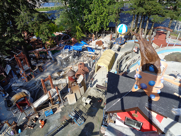 On July 30 of last year I met Chris at the site of what was to become Cultus Lake Adventure Park. He had brought his 65 foot tall snorkel lift to the site. We first used a spray bomb to lay the proposed park layout onto the ground. We then jumped in the snorkel lift to go to the top height of the ferris wheel to see how everything would look. The job site was dead flat at that point. We had to imagine how it would appear when done. Everything was still in question and in flux. The features and rides were just ideas back then - except the ferris wheel, bumper boats and the carousel.