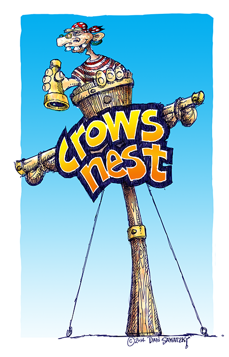 After a busy work day in the shop it is always relaxing and fun to sit down in the evenng and do a little sketching. Tonight my project was the sign concept for the spin/drop ride planned for Skallywag Bay in Trinidad. We are calling the ride Crows Nest with Specs perched on top of the mast with a telescope.