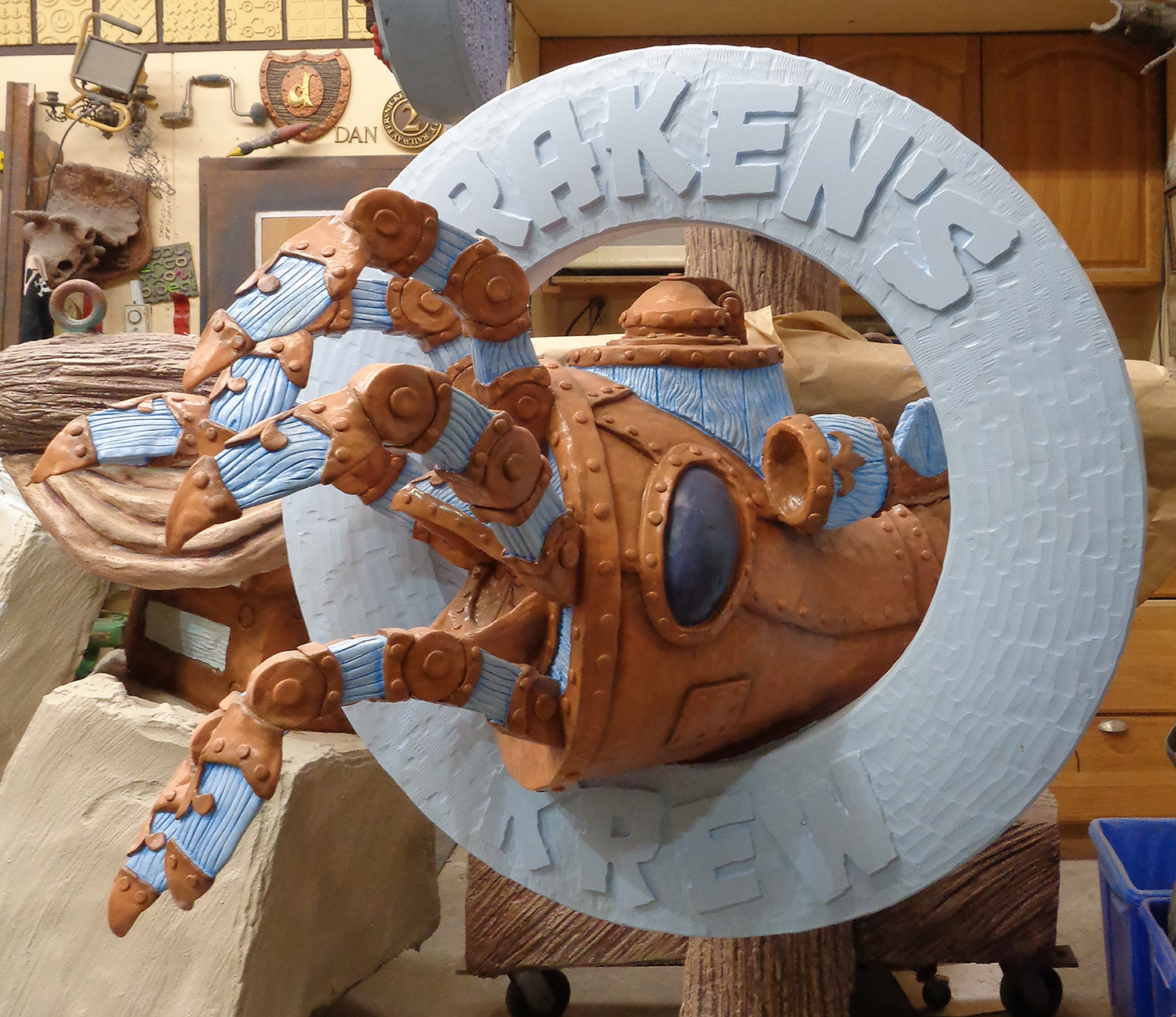 We've really been pushing the concrete work in our shop of late with only a handful of features remaining left to sculpt for the Trinidad project. Each day when the concrete needs sculpting the painting is abandoned. This means the shop is littered with almost complete projects. The KRAKEN sign is one of the many slowly making its way through paint department. Each day a little bit is done as time permits and it is looking absolutely awesome.