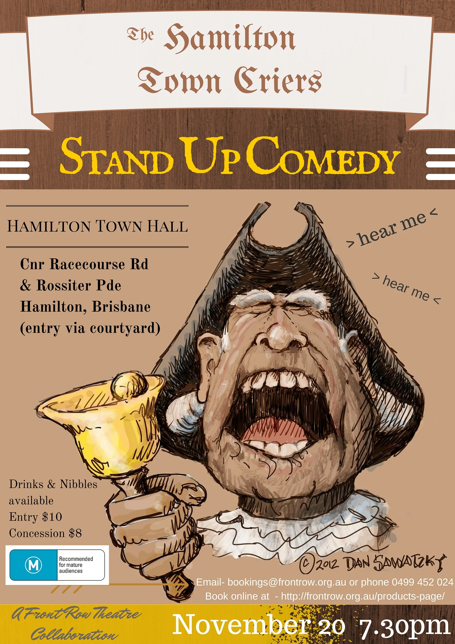 The internet has changed many things in profound ways. It allows the sharing of ideas and images instantly around the world. I was recently contacted by Emily from Brisbane, Australia. She's a stand-up comedian and asked me for the one time use of an image I had posted to our blog some years ago. She understood I held the copy write and that she needed permission to use it which unfortunately is rare these days. The image was the concept art for the town crier which I had designed for a sign at the Fox and Hounds Pub. I granted permission for the single use and sent her the high resolution file. Today, she kindly sent me a file of the poster she had created. If you happen to be in Brisbane on November 20 check them out. :)