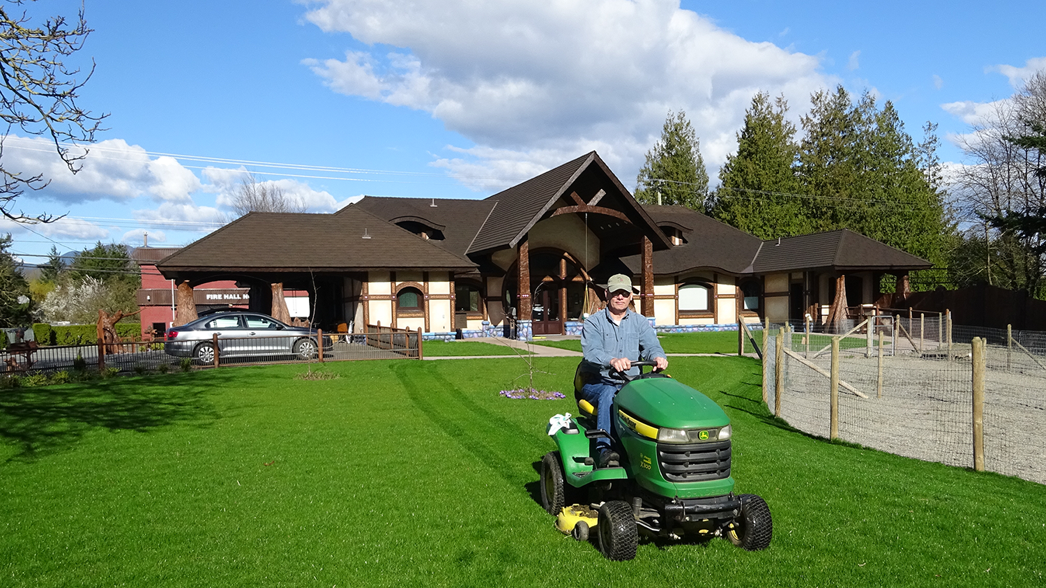This morning in the bright sunshine it was evident that the lawn really did need mowing. and it was a balmy 14 degrees celsius (just over 57 degrees fahrenheit) - a perfect day for mowing the lawn. It was so warm the tractor started on the first try - without having to break out the jumper cables or battery charger. I felt a teeny bit bad while having my picture taken in my shirt sleeves knowing that back east the weather isn't quite so nice. I got over that feeling in a hurry as the scent of fresh cut grass wafted over me.