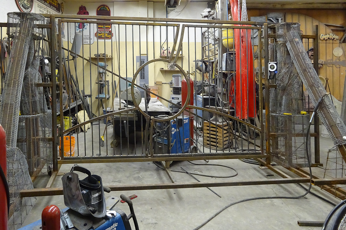At any one time in our shop there are many projects on the go in all stages of finish. Still more are in the planning stage as well. It certainly keeps the whole crew busy! One of the projects currently in the welding area is the entrance gate(s). It is built in two pieces to allow it to fit inside a shipping container. There's been a couple revisions to the design as we built. The diagonal braces were dropped in favor of the arched horizontal bar. Because of height restrictions the arched top bar was also eliminated. We'll begin applying the sculpted concrete to this piece on the next shop (rain) day.
