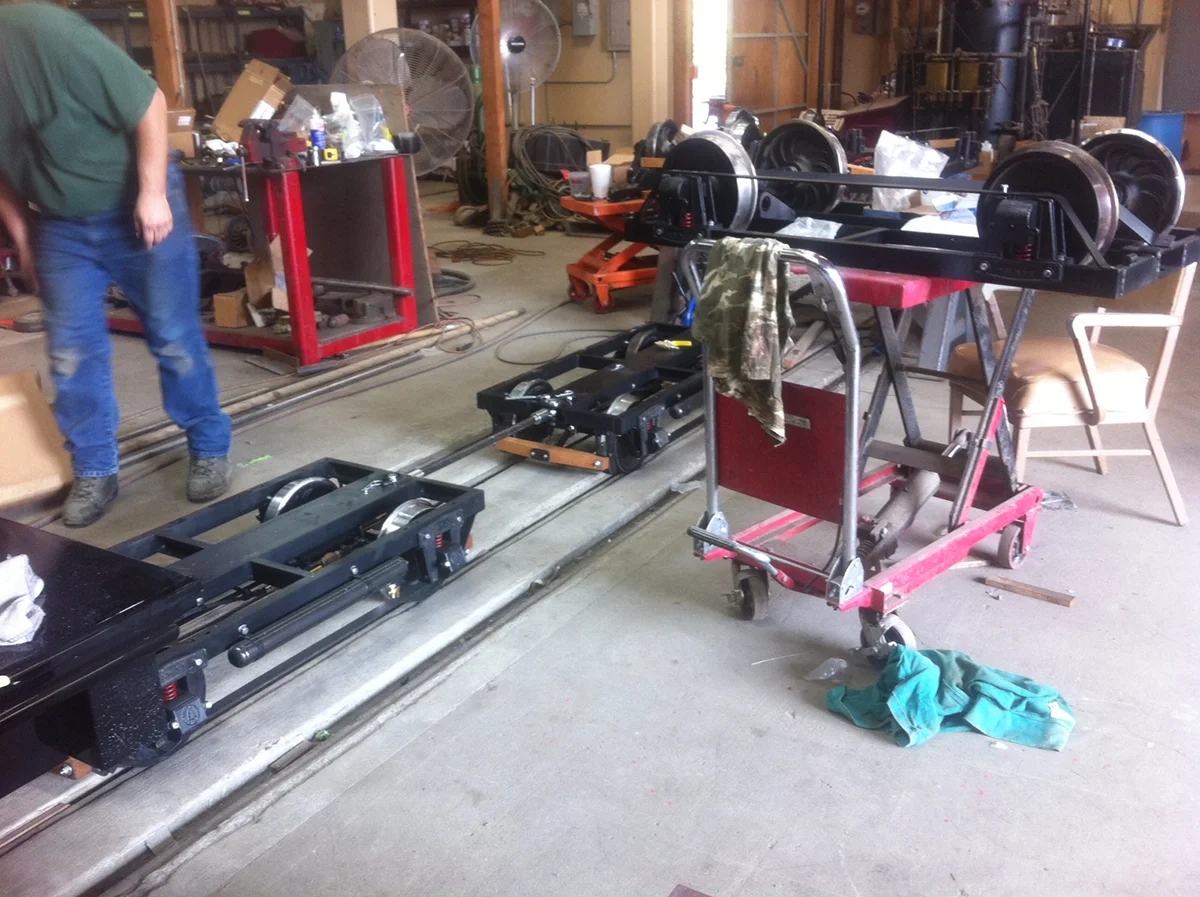 In our shop we specialize in creating the visual parts of the projects. Often, hidden underneath our work is some pretty sophisticated machinery which is crafted by some very talented vendors. These companies are often far, far away. The Scallywag Bay Adventure Park train is a good example. While we build the engine and car bodies here in our shop, our partners, Hillcrest Shops are building the mechanical components in California. These guys are the very best in the business when it comes to theme park trains. I received some progress photos this weekend and things are coming together nicely. Sean and his crew take a great deal of pride in making things perfect.