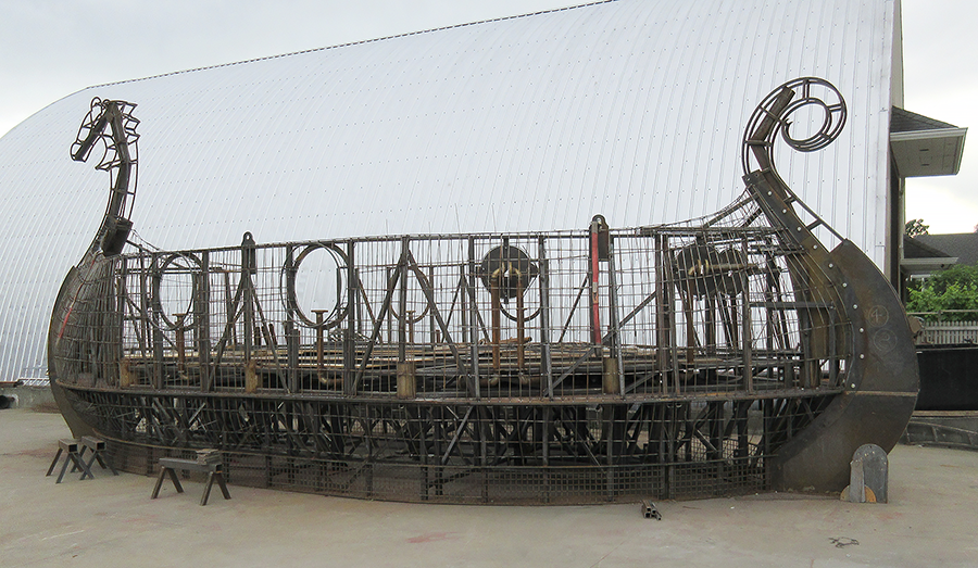 We pressed hard to totally finish the welding on one side of the Viking ship frame. Our goal was to get it polished off in time to take a trip to Silver City Galvanizers on the truck that will soon be picking up the masts that were sent late last week. We'll lift the top section off and then disassemble it for the journey. Just before quitting time today we were done and it was time to rearrange the yard to make room. We loosened off the bolts and will do the lifting first thing tomorrow. Right beside us the painting crew finished off the base coats on the large target and began the glazing. The huge piece is beginning to gather a lot of color!