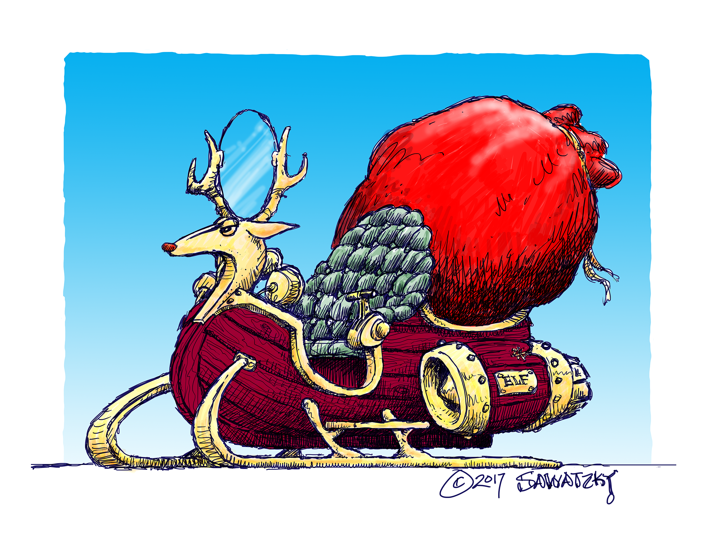 This evening Janis & I did our Christmas shopping for all of the kids in our lives. By the time we were through the store the shopping basket was overflowing. We had great fun picking out the kid's gifts. As we packed everything into the car I was reminded of a recent concept I had done of Santa's sleigh - jet powered of course to make it around the world in time to deliver all of the presents to the kids. Christmas is coming fast and we are almost ready!