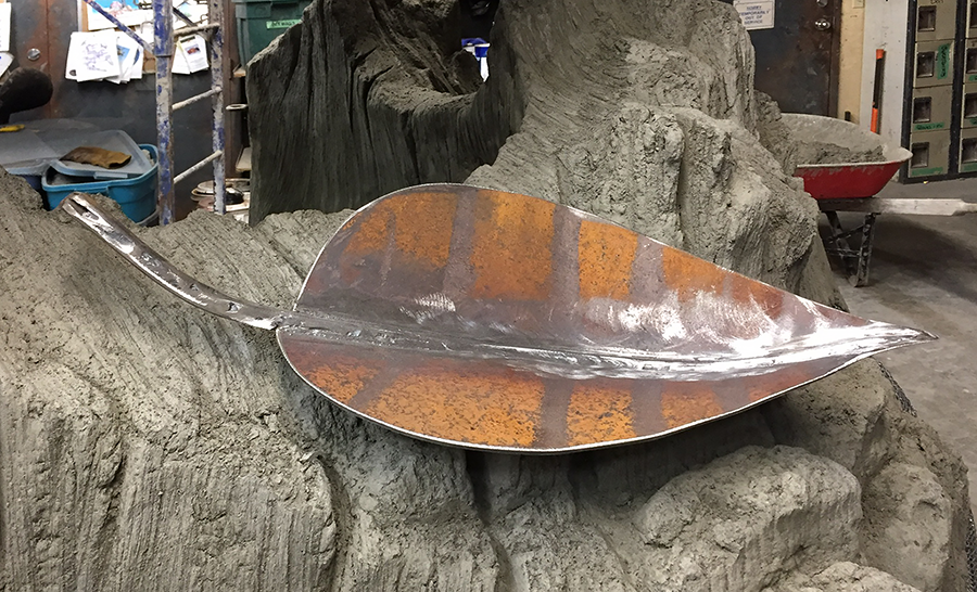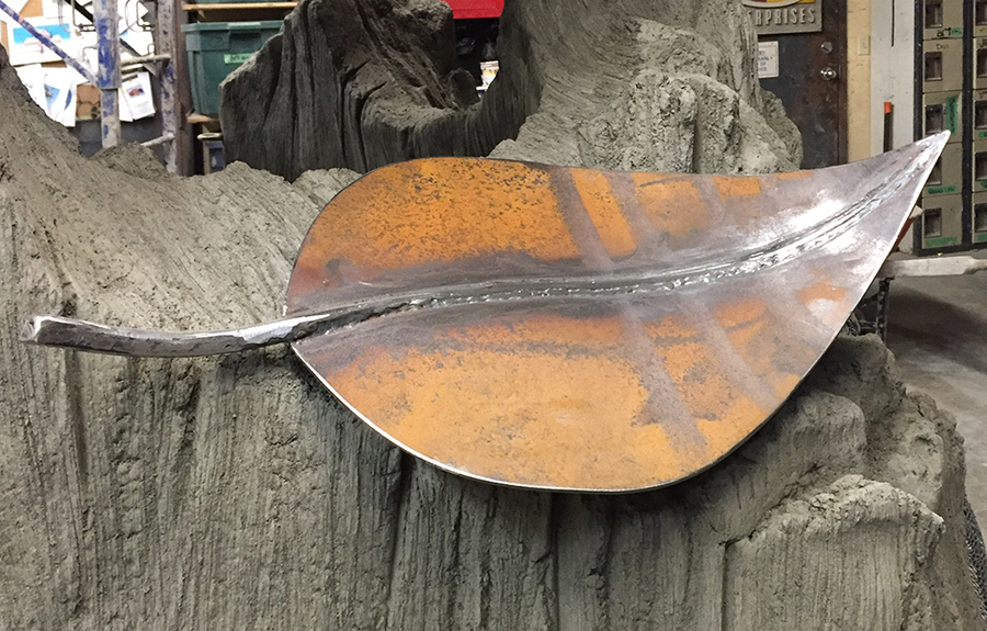 Through the years we have applied many different types of leaved and greenery to our sculpted trees. We've cut apart fake Christmas trees. We've purchased specially made outdoor plastic foliage. And we've left many trees bare. Our search was always for a permanent leaf, often of a larger than normal scale. With the PNE project we decided to simply make our own. The cut file only took minutes and the CNC plasma cutter dutifully and quickly cut out the shapes I needed from some 1/8" thick plate steel. We made the leaves in two sizes - 14" and 16" long. I bent each one to a different shape and then formed and welded the curved stem down the middle. A few of the leaves received giant mechanical bug bites from them to add some authenticity. We'll send them off to the powder coaters this week to get their long lasting green. These leaves will be tough!