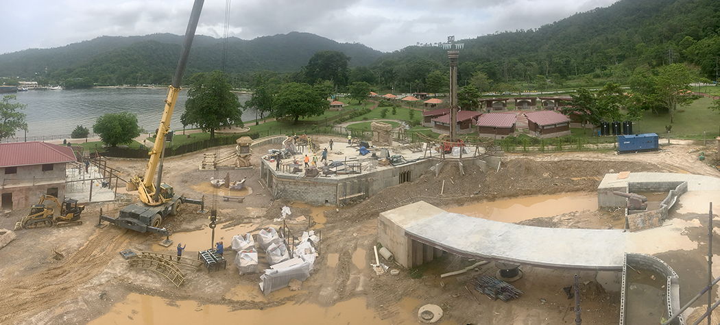 Skallywag Bay Adventure Park is coming together at a faster pace now. While there is still much to do, the story telling elements are now becoming evident. With the installation of the rides now largely complete, the final section of the bridge and the ramp up to the top level of the park can be worked on. The rock work is progressing rapidly, transforming the bare concrete walls into rock work faces. The final large lift of the Skull Rock head happens tomorrow. Over the next weeks the landscape will rapidly change as hundreds of loads of fill are trucked and tamped into place. The previously flat site will have hills, valleys and a mountain. Key large elements will also be lifted to their permanent homes and work will begin on installing the light fixtures and other visible infrastructure. I'll be watching closely from home over the next few weeks and then return to check progress and lay out the next critical steps.