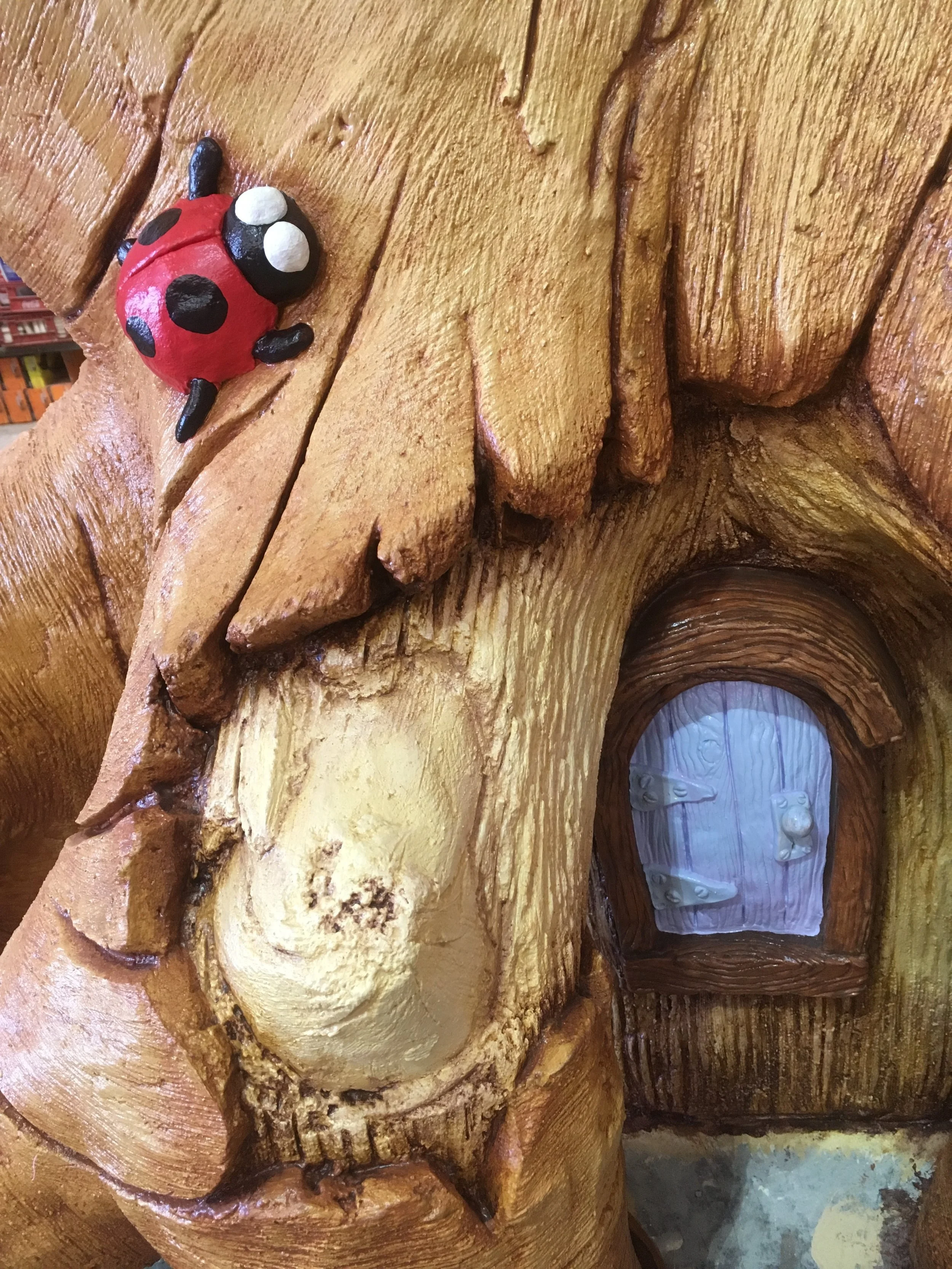Dayna's tree is a few hours from finished and looking great. As always we have included a few fanciful details. Tucked among the roots of the tree is a little fairy door. Perhaps it is the ladybug's home?