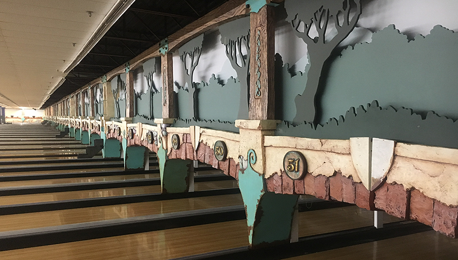 We've been busy in the shop for many months building pieces for NEB's Fun World in Oshawa, Ontario. The pieces for the bowling alley were large and designed to fit together at the end of the lanes and up the side walls. There are 52 lanes in total, making for a lot of pieces to fit together. In our shop we never had more than two pieces together as they were simply too large.